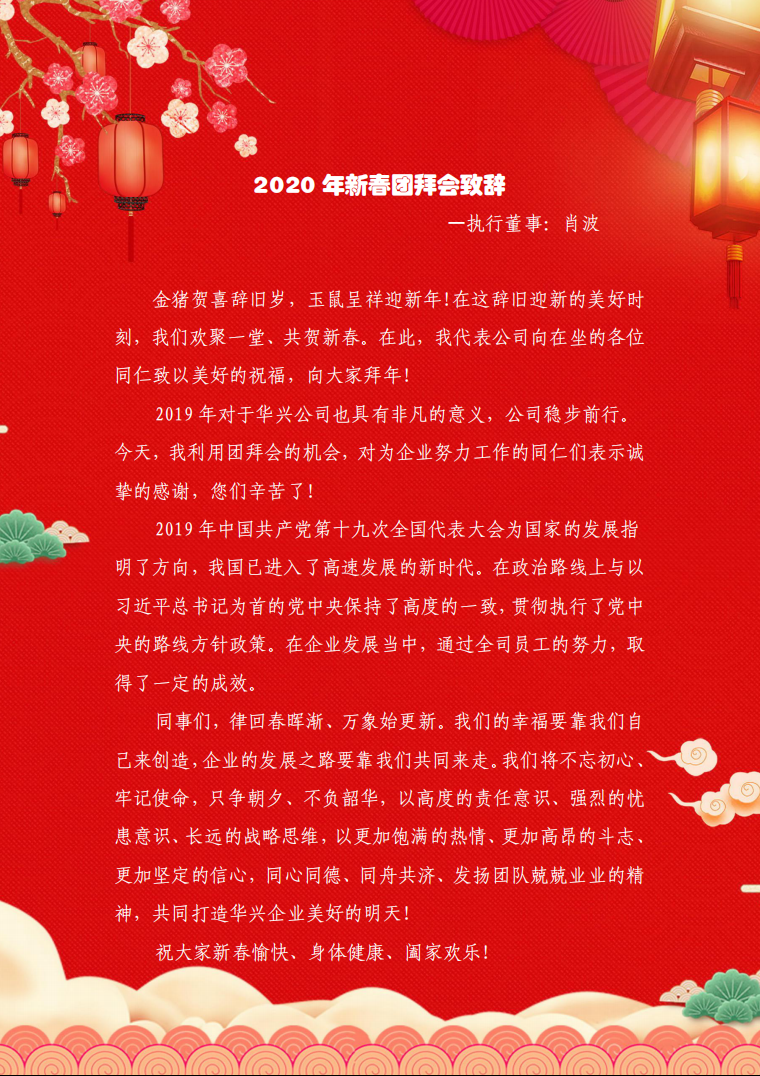 律回春晖渐、万象始更新。2020年2月9日,我司“ 不忘初心 · 筑梦前行 ”2020新春团拜会圆满召开,执行董事肖波、总经理陈洪波、党支部书记李盛秀等领导出席了团拜会并向华兴全体同仁致了新年贺词。